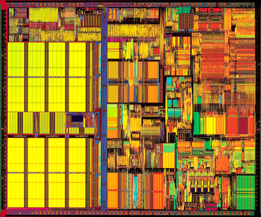 As with the CPU, it consists of a die (shown left, magnifyed many times) made of silicon with the millions and millions of logic gates etched on. This die is then packaged in plastic or ceramic to protect it (shown right, the die is the small rectangle in the middle), and the packaged chip is then soldered on to a printed circuit board with other memory chips. The completed assembly is called a memory module. There are many different types, the one shown on the far right is called a SODIMM, or Small Outline Dual In line Memory Module.