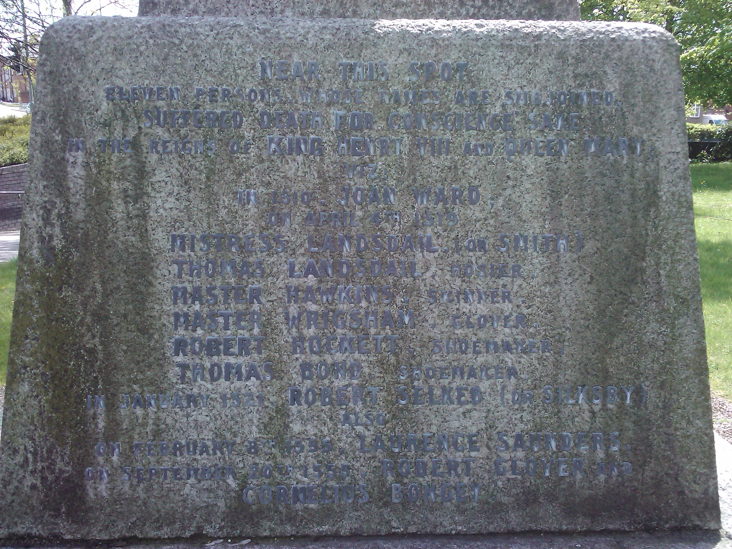 Near this spot Eleven persons whose names are subjoined suffered death for conscience' sake in the reign of King Henry VIII and Queen Mary In xxxx, Joan Ward, on April 4th, 1519 Mistress Landsdail (or Smith) Thomas Landsdail, Hosier. Master Hawkins, Skinner. Master Wrigsham, Glover. Robert Hockett, Shoemaker. Thomas Bond, Shoemaker. In January 1521, Robert Selkes (or Silksby) Also On February 8th, 1555, Laurence Saunders. On September 20th, 1555, Robert Glover and Cornelius Bongey.