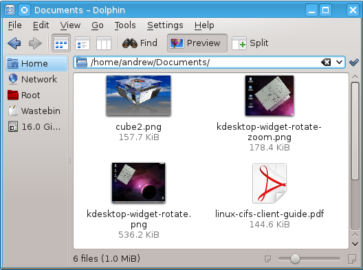 What would be good is to be able to see an icon preview and the file size or date created as well. Not too much use for a word processor document, but a visual preview of graphic files is invaluable. Maybe it's not such a surprise that Linux and KDE can show just this information and windows can't. The left hand picture shows KDE displaying a preview of pictures with the file size below. Other information such as file creation, owner, group and permissions can be shown as well, but showing too much information makes the display cluttered, but at least the user has the choice of what to show. The slider at the bottom zooms previews as well as icons and text.