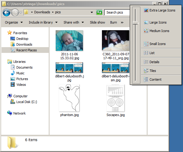 Finally Windows allows icon scaling, there is a slider which controls icon preview size, at some point this switches back to a details view with each file information on a seperate line. Detail view is by far the most useful view and can be configure to show the desired column headings, but you could do this in xp too. In details view, you can see file size and other attrubutes, but these disappear once the display turns to preview mode.