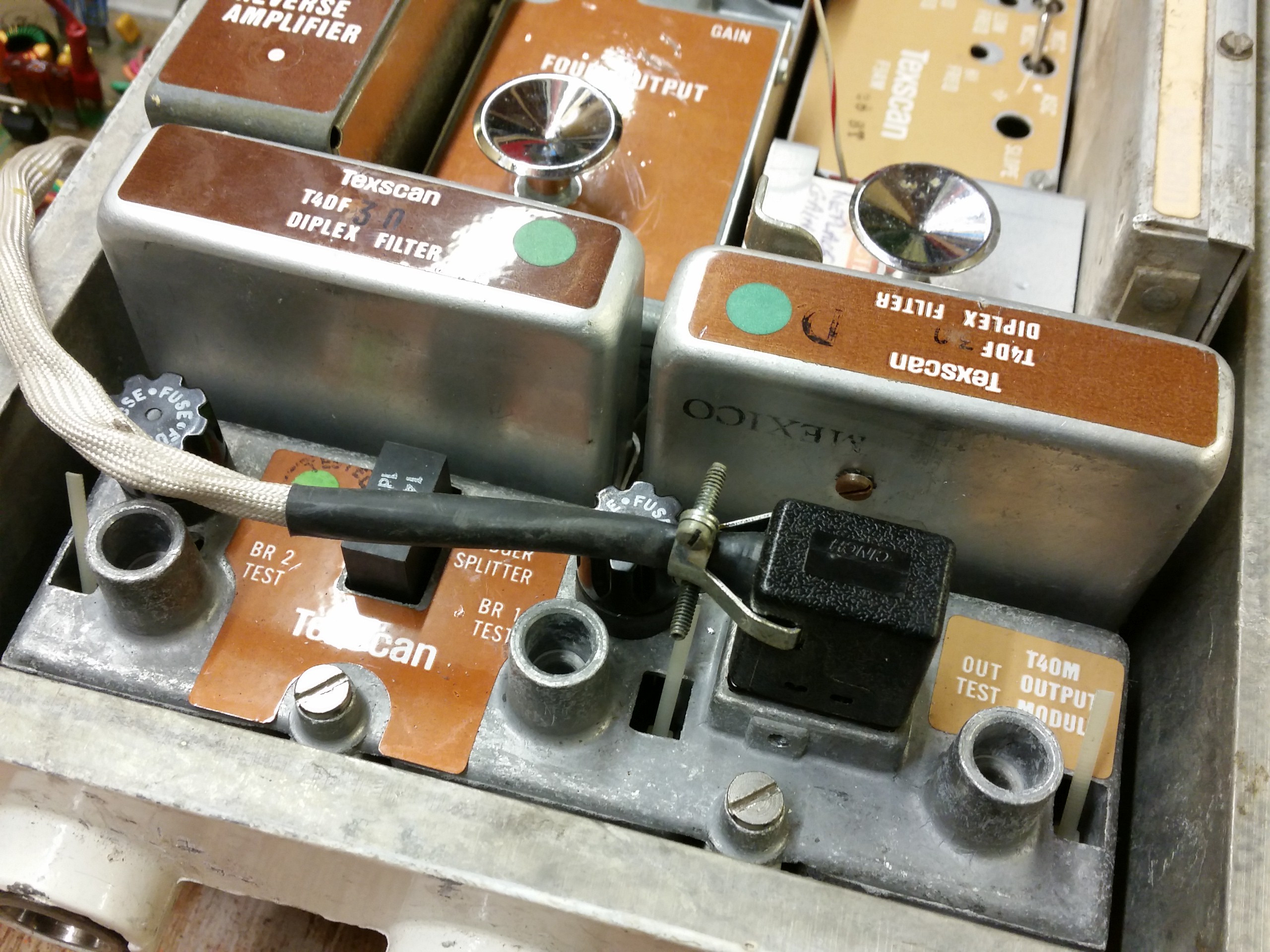 - Texscan Amp showing the power isolator link fixed to a cable tie.